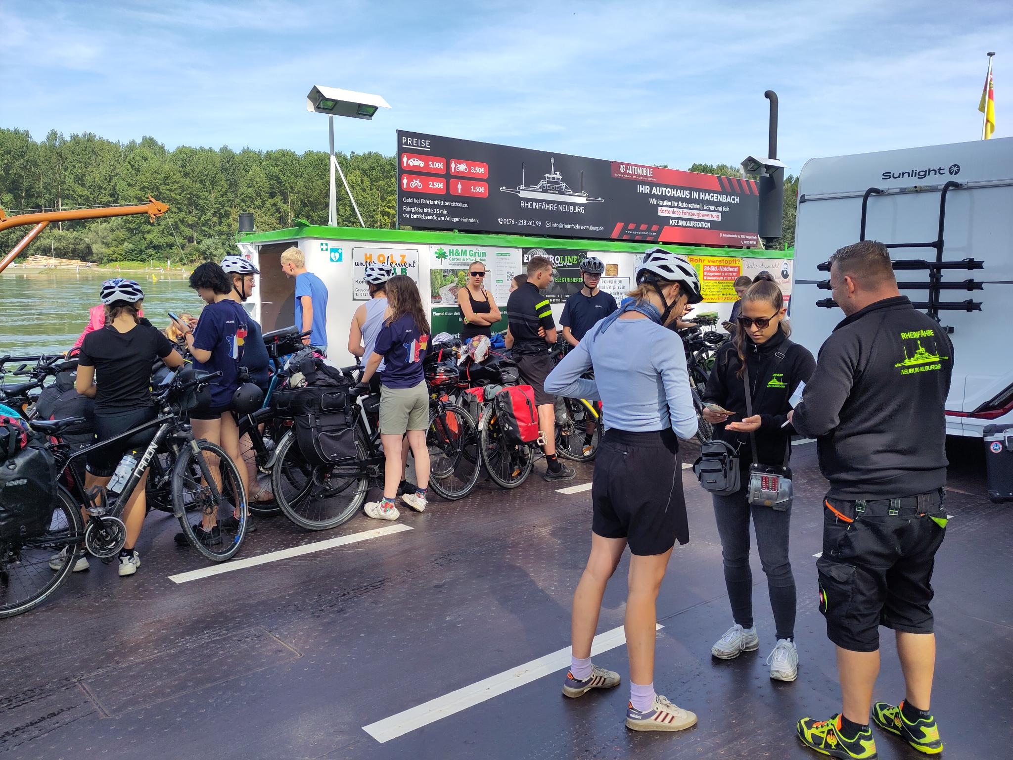 Nachdem wir um 9:30 Uhr in der Waldorfschule in Karlsruhe aufgebrochen waren, dauerte es nicht lange bis wir mit der Fähre auf die andere Rheinseite wechselten. Dort angekommen fuhren wir noch ein Stück mit den Fahrrädern bis bis wir einen Höhepunkt des Tages und vielleicht sogar der ganzen Fahrt erreichten: Die Grenze zu Frankreich. Viele machten Fotos oder Videos, wie sie zuerst in Deutschland standen und mit einem Schritt die Grenze rüber zu Frankreich überschritten.